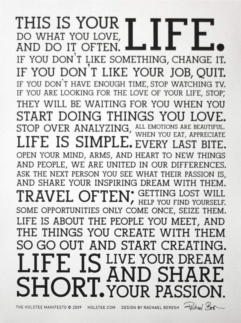 Manchmal muss man etwas niederschreiben, um sich Klarheit zu verschaffen, es auch wirklich zu verinnerlichen und umsetzen zu können. Ich finde das Manifesto von Holstee wirklich bemerkenswert, weil es viele wichtige und richtige Ansichten und Einsichten vertritt. Am Ende liegt es ja an uns selbst, wie unser Manifest aussieht. Nach welchen Regeln wollen wir leben, was ist uns denn wirklich wichtig? Getrieben von äusseren Zwängen, gesellschaftlichen, familiären und noch einigen anderen, vergessen wir manchmal was wir selbst wollen und richtig finden.